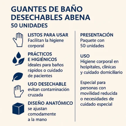 Guantes de Baño Desechables Abena  son una solución práctica y higiénica para la limpieza personal. Impregnados con jabón, ofrecen una limpieza eficaz sin necesidad de productos adicionales. Su diseño desechable garantiza una higiene óptima sin complicaciones, siendo ideales para personas con movilidad reducida o para su uso en entornos hospitalarios. El paquete de 50 unidades proporciona una opción económica y conveniente para el cuidado diario.