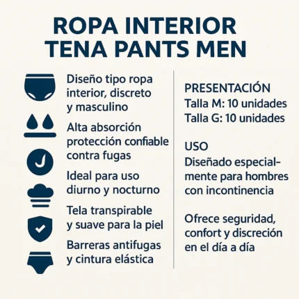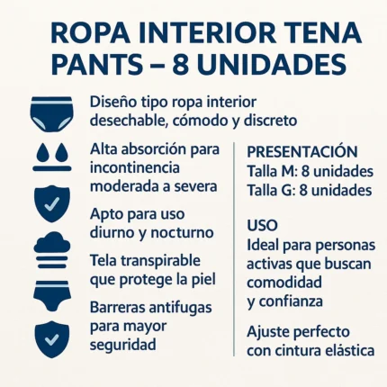ofrecen comodidad, discreción y máxima absorción para personas con incontinencia leve a moderada. Su diseño anatómico tipo ropa interior brinda un ajuste seguro y confortable, permitiendo libertad de movimiento. Cuentan con tecnología de absorción avanzada que mantiene la piel seca y controla olores. Fabricados con materiales suaves y transpirables, ayudan a prevenir irritaciones. Son fáciles de colocar y retirar, proporcionando una solución práctica y discreta para el uso diario.
