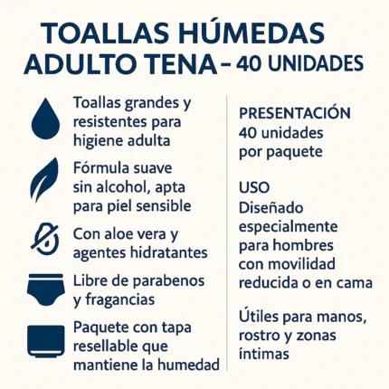 Las Toallas Húmedas Adulto Tena están diseñadas para una limpieza eficaz y delicada de la piel, especialmente en personas con incontinencia o movilidad reducida. Son suaves, hidratantes y respetuosas con la piel, incluso la más sensible. Además, cuentan con tecnología de control de olores para mantener la frescura y la discreción. Estas toallas no contienen alcohol ni productos irritantes, lo que las hace ideales para el uso diario. Presentadas en un práctico paquete de 40 unidades, son perfectas para mantener la higiene personal de manera rápida y cómoda.