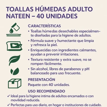 toallitas húmedas para adulto Nateen brindan una limpieza suave, hidratante y refrescante. Enriquecidas con aloe vera y vitamina E, protegen la piel y previenen la resequedad. Su material resistente y ultra suave permite una higiene efectiva sin irritaciones. Son libres de alcohol y parabenos, ideales para pieles sensibles. Su fórmula neutraliza olores y deja una sensación de frescura. El empaque con cierre hermético mantiene la humedad. Perfectas para adultos mayores, pacientes en cama o higiene rápida en cualquier momento.