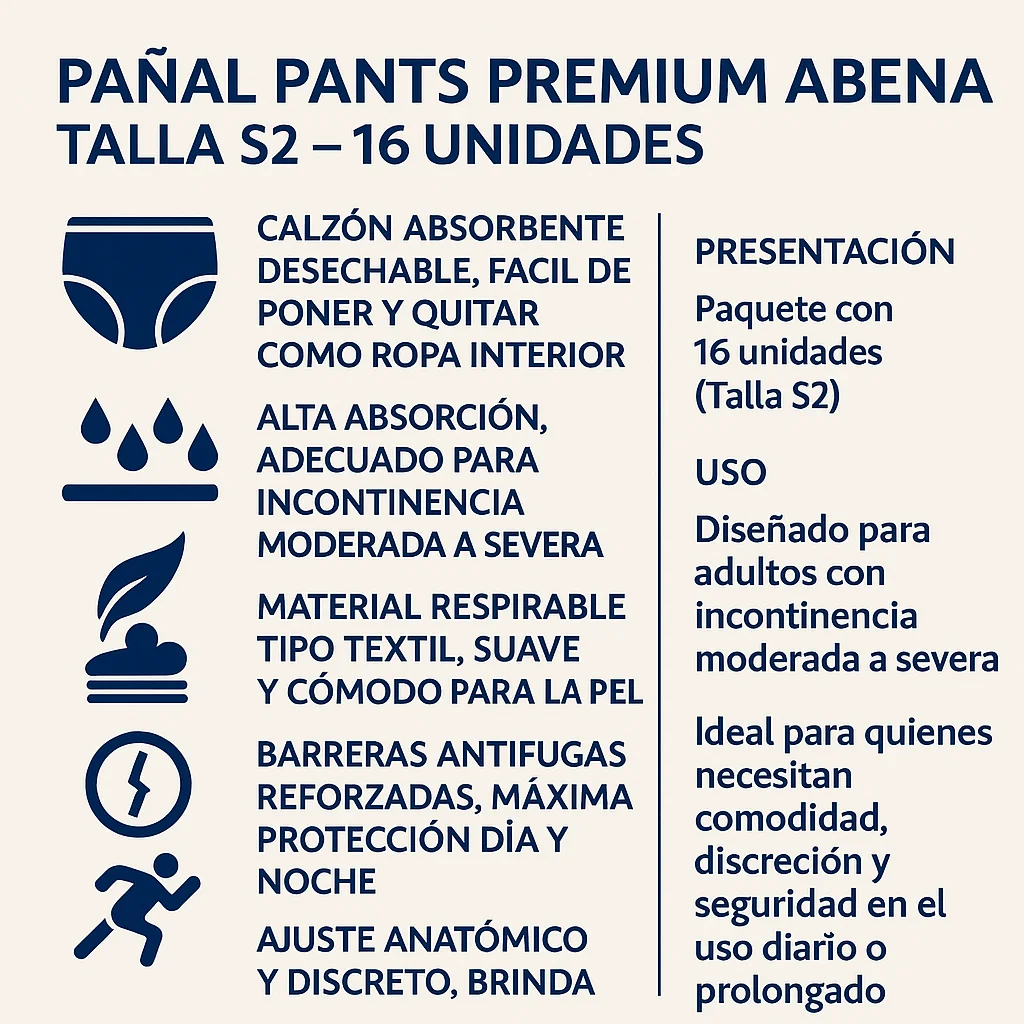 El Pañal Pants Premium Abena Talla S2 es ideal para personas con incontinencia leve a moderada, que buscan una opción cómoda y discreta. Su diseño tipo ropa interior lo hace perfecto para personas activas que desean mayor independencia en su uso. También es adecuado para adultos con movilidad reducida, ya que su fácil colocación y retiro agilizan el proceso de cambio.