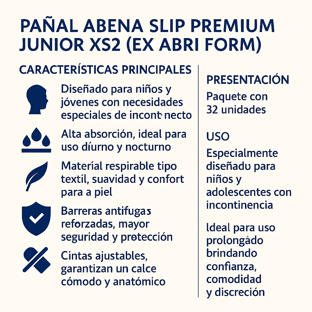 El Pañal Abena Slip Premium Junior XS2 es ideal para niños y adolescentes que requieren un pañal seguro y absorbente para uso diurno o nocturno. Es perfecto para personas con incontinencia moderada a severa y es adecuado tanto para uso en el hogar como en entornos médicos o de cuidado especializado.